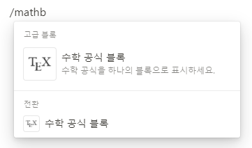 마찬가지로 빈 블록에서 '/수학공식블록'이라고 치면 된다. 인라인 수학 공식과 마찬가지로 여러 방법이 있는데 다른'/수학'과 같은 명령어는 마우스로 수학 공식 블록을 선택해줘야 하는 번거로움이 있다. 따라서 필자는 주로 '/mathb'라는 명령어를 사용한다.
